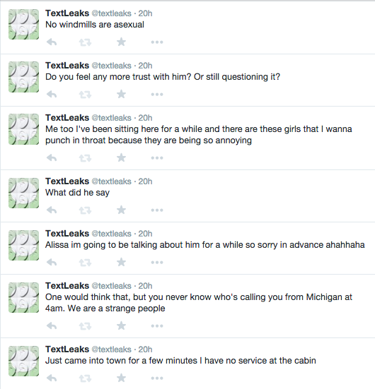 Earlier in the year, I had posted my incoming text messages to Twitter and Facebook as a way to breach social expectations of privacy and communication. TextLeaks is an extension of that idea. The bot posts text messages that I have received as well as sent to its Twitter feed. The social breach I had originally carried out was happening in real time. However TextLeaks takes messages from my past archive of conversations. Each post only contains the message with no indicator of whether I sent or received that particular SMS.