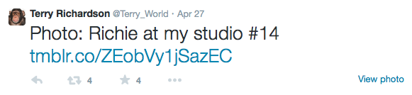 I started this project with two concepts in mind. The first was looking at fashion photographer Terry Richardson and trying to bring to light his inappropriate actions. He is known for sexually harassing the models he works with. My original idea for the Twitter bot was to retweet anything he tweeted and post it to my page with a link to an image that I created.The image is shown below: