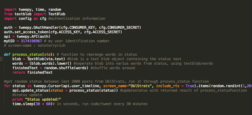 For some reason, that inspires me a lot more than actual sentences or questions. This is when I decided that I wanted to create a Twitter bot that takes random words from the Oblique Strategies tweets and creates new phrases and orders. I used a Python library called TextBlob in order to do this. What it does is provide an API to pick apart tasks dealing with language, “part-of-speech tagging, noun phrase extraction, sentiment analysis, classification, translation, and more.” I wrote a function in the code to take the random text and generate something new. I used Sublime Text in order to do this, typed the Consumer Keys, Access Keys and then also used Tweepy to assist which allows communication to Twitter.