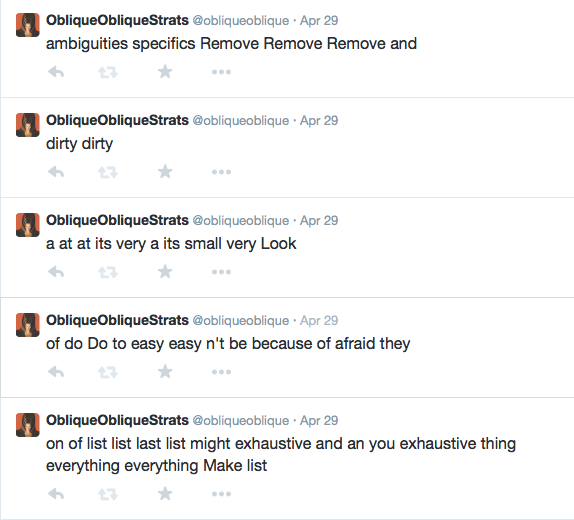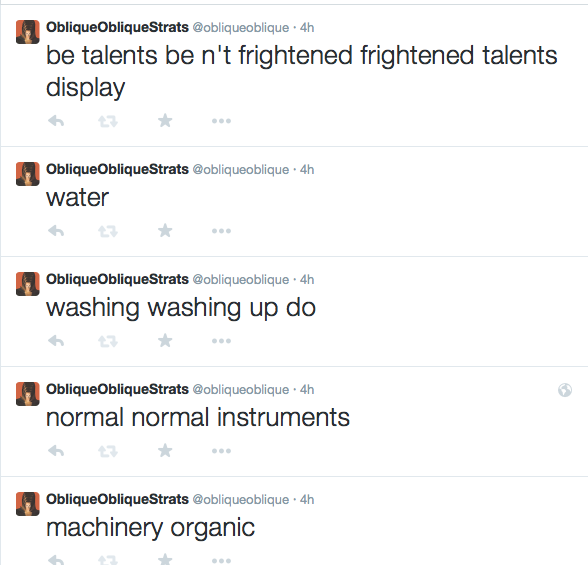 This Twitter bot was going to be all about emphasizing the flaws and removing specifics. Along with this, I realized that I enjoyed the Oblique Strategies more when they were random words put together. For example: